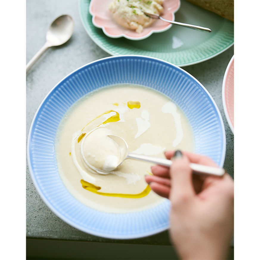 たとえば、両親と過ごす、日頃の感謝を分かち合うランチのひととき。ディーププレートに、丁寧に下ごしらえをしたスープを注ぎ、オリーブやバター、パンを添えた一見シンプルなお料理も、IRISが持つプレイフルな雰囲気は、そのひとときに自然と幸福感と笑顔を運んできてくれます。シンプルな料理だからこそ、彩り豊かな器を組み合わせたコーディネートがよく似合う。贈る人も、贈られた人も思わず心が弾む、明るく楽しい食卓が生まれます。